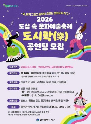 광주광역시 서구(구청장 김이강)는 지역 예술단체의 활동 기반을 넓히고 시민의 문화 향유 기회를 확대하기 위해 도심 속 문화예술축제 '도시 락(樂)'을 본격 추진한다.서구는 올해 4월부터 10월까지 ▲봄(설렘 락) ▲여름(열정 락) ▲가을(감성 락) ▲찾아가는 아파트 작은음악회(함께 락) 등 4개 테마로 일상 속 문화예술 공연을 선보인다. 공연은 주민이 즐겨 찾는 공원과 광장 등에서 열리며 계절별 특색을 반영해 도심 곳곳에 문화의 활력을 더할 계획이다.특히 '찾아가는 아파트 작은음악회'는 아파트 단지를 직접 찾아가 단지 특성에 맞는 공연을 제공해 생활권 내 문화 접근성을 높일 예정이다. 공연 일정 등 자세한 내용은 서구청 문화관광 누리집에서 확인할 수 있다.서구는 광주광역시를 중심으로 활동하는 문화·예술적 역량이 있는 40개 공연팀을 모집한다. 이중 청소년·청년팀을 20% 이상 선정하고 장애인 예술팀도 최소 1팀 이상 포함해 다양한 주체가 참여하는 포용적 문화환경을 조성한다.서구는 서류와 공연 영상 심사를 거쳐 대중가요·서양음악·국악·무용·마술·다원예술 등 다양한 장르의 팀을 선정할 예정이다. 공연팀에는 평가 점수에 따라 공연보상금을 차등 지원한다.모집 기간은 오는 27일까지이며 참여를 희망하는 팀은 서구청 누리집 고시공고란의 관련 서류를 준비해 서구청 문화예술과를 방문하거나 전자우편(njrhkr06@korea.kr)으로 신청하면 된다.채봉길 문화예술과장은 "도심 속 문화예술축제를 통해 시민이 일상 공간에서 자연스럽게 문화를 향유하길 기대한다"며 "도심에 활력을 더할 역량 있는 예술인의 많은 참여를 바란다"고 말했다.한편 서구는 지난해 도심 속 문화예술축제 '도시 락'을 통해 지역 예술단체 40개 팀을 발굴하고 풍암호수공원·상무시민공원 등에서 버블매직, 버스킹 등 총 81회 공연을 선보였다.