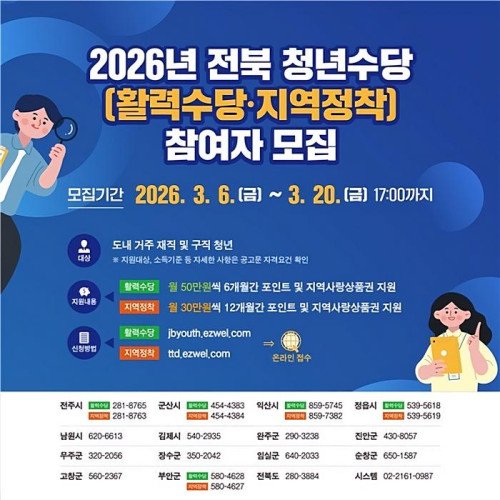익산시가 취업 준비부터 지역 정착, 자산 형성까지 청년의 자립을 돕는 전방위 지원에 나섰다.익산시는 지역인재 유출 방지와 청년들의 생활 안정을 지원하기 위해 총 32억 원 규모의 청년 지원 사업 참여자를 모집한다고 5일 밝혔다.지원 사업은 ▲전북형 청년활력수당 ▲전북청년 지역정착 지원사업 ▲전북청년 함께 두배적금 등 3개 사업이다. 지원 대상은 익산시에 주민등록을 둔 18∼39세 청년(1986년 1월 1일∼2007년 12월 31일 출생)으로, 중위소득 및 근로 요건 등을 충족해야 한다.'전북형 청년활력수당'은 미취업 청년의 구직활동 부담을 덜기 위해 매월 50만 원씩 6개월간 최대 300만 원을 지원하는 사업이다.수당은 학원·인터넷 강의 수강료, 자격증 응시료, 면접활동비 등 구직활동 경비로 사용할 수 있으며, 참여 기간 중 취·창업에 성공하면 50만 원이 추가 지급된다. 진로개발·역량강화 교육과 맞춤형 멘토링도 함께 제공된다.지원 대상은 가구 기준 중위소득 150% 이하의 미취업 청년으로 320여 명을 선정한다. 신청은 오는 6일 오전 9시부터 20일 오후 5시까지 전북형 청년활력수당 누리집(jbyouth.ezwel.com)에서 가능하다.'전북청년 지역정착 지원사업'은 사회초년생이 지역에 안정적으로 정착할 수 있도록 매월 30만 원씩 12개월간 최대 360만 원을 지원하는 사업이다.지원금은 사행성·유흥업종 등 일부 제한 업종을 제외하고 건강관리, 교육, 문화·여가 등 다양한 분야에서 사용할 수 있다.지원 대상은 가구 기준 중위소득 150% 이하로 농업·임업·어업·중소기업·문화예술·연구소기업 등 6개 분야에서 최근 3개월 이상 근무하고 있는 청년이다.신청은 오는 6일부터 20일 오후 5시까지 전북청년 지역정착 지원사업 누리집(ttd.ezwel.com)을 통해 진행되며, 최종 480여 명을 선정해 5월 발표할 예정이다.'전북청년 함께 두배적금'은 청년이 매월 10만 원을 저축하면 시가 동일 금액을 적립해 2년 만기 시 이자를 포함해 최대 500만 원을 받을 수 있는 자산 형성 사업이다.참여자는 금융교육과 컨설팅을 통해 저축 습관 형성과 생애 재무설계 역량을 높일 수 있다. 지원 대상은 가구 기준 중위소득 140% 이하의 근로 청년이다.신청은 오는 16일 오후 6시까지 전북청년 함께 두배적금 누리집(double.jb2030.or.kr)에서 온라인으로 접수하며, 200여 명을 선정해 지원할 예정이다.특히 익산시는 올해부터 청년활력수당과 지역정착 지원사업 지원금의 일부를 익산사랑상품권 '다이로움'으로 지급해 지역 내 소비를 확대하고 지역경제 선순환 효과를 높일 계획이다.사업별 신청 방법과 자격 요건, 제출 서류 등은 익산시 및 익산청년시청 누리집에서 확인할 수 있다. 더욱 자세한 사업별 문의는 청년활력수당(063-859-5745, 5325), 지역정착 지원사업(063-859-7382, 5325), 두배적금(1660-2040)으로 연락하면 된다.익산시 관계자는 "각 사업은 선착순이 아니라 기준에 따라 평가해 선정되는 만큼 공고문 요건을 꼼꼼히 확인해 기한 내 신청해 달라"며 "청년들이 익산에서 안정적으로 미래를 설계할 수 있도록 지원을 더욱 강화하겠다"고 말했다.