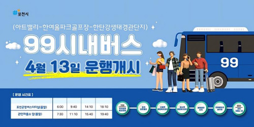 포천시가 주요 관광지와 북부권 지역을 연결하는 관광특화 시내버스 신규 노선 99번을 신설하고 13일 본격 운행에 들어갔다.이번 노선 신설은 포천의 핵심 관광자원을 대중교통망으로 연결해 관광객의 이동 편의를 높이고, 체류형 관광 기반을 강화하기 위해 추진됐다.99번 노선은 포천터미널을 출발해 아트밸리와 한여울파크골프장, 한탄강 생태경관단지를 거쳐 관인면까지 운행한다. 하루 4회 왕복 운행하며, 주요 관광지와 생활권을 함께 연결해 관광객은 물론 교통취약지역 주민의 이동 편의 향상에도 도움이 될 것으로 기대된다.포천시는 이번 신규 노선이 아트밸리와 한탄강 권역 등 주요 관광지 간 접근성을 높여 방문객 이동 편의를 증진하고, 대중교통 이용 활성화를 통해 지역경제와 관광산업에 활력을 더할 것으로 보고 있다.특히 시는 축제와 관광 성수기 수요에 맞춘 탄력적 운영도 함께 검토하고 있다. 기본 운행체계를 바탕으로 탑승 수요를 모니터링해 축제기간에는 운행 여건에 따라 대형버스를 추가 투입할 계획이다.포천시 관계자는 "이번 99번 노선 신설은 포천의 주요 관광자원을 대중교통으로 촘촘하게 연결해 관광 접근성을 높이고 시민과 관광객 모두의 이동 편의를 개선하기 위한 조치"라며 "앞으로도 관광 활성화와 교통복지 향상을 함께 이끌 수 있는 교통체계를 지속적으로 확충해 나가겠다"고 말했다.