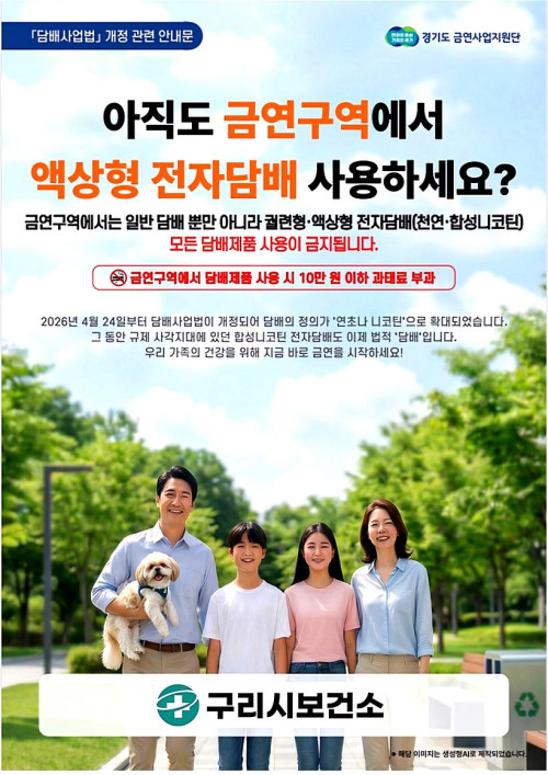 구리시 보건소는 '담배사업법' 및 '국민건강증진법' 개정으로 담배의 정의가 확대됨에 따라, 지역사회 내 담배 규제 사항을 점검하고 금연 문화를 확산하기 위해 4월 24일부터 금연 구역 점검·단속과 금연 홍보 운동을 한다고 밝혔다.지난해 개정된 '담배사업법'은 기존 '연초의 잎'을 원료로 한 제품에 한정됐던 담배의 정의를 '연초 또는 니코틴'을 원료로 제조한 제품까지 확대했다. 이에 따라 그동안 규제 사각지대에 놓여있던 일부 액상형 전자담배도 일반 담배와 동일한 규제를 받게 된다.구리시 보건소는 효과적인 법 정착을 위해 지역 주민으로 구성된 금연 지킴이와 합동 점검반을 구성해 액상형 전자담배를 포함한 모든 담배 제품의 금연 구역 내 흡연 행위를 집중적으로 점검할 계획이다. 해당 제품을 금연 구역에서 사용하면 '국민건강증진법'에 따라 10만 원 이하의 과태료가 부과되며, 지자체 조례로 지정된 금연 구역이나 금연 아파트 내 금연 구역 위반 시에는 7만 원의 과태료가 부과된다.특히 이번 점검 기간에는 '금연 지킴이'와 함께 거리 홍보 운동을 병행한다. 금연 지킴이들은 상가 밀집 지역과 학교 주변을 순회하며 홍보물을 배부하고, 법 개정에 따른 변경 사항을 시민과 영업주에게 안내할 예정이다.홍보 운동에 참여 예정인 한 금연 지킴이는 "신종 전자담배까지 규제가 확대돼 아이들이 노출될 위험이 줄어들 것으로 기대한다"라며 "이웃의 건강을 위해 적극적으로 금연 홍보에 참여하겠다"라고 소감을 전했다.구리시 관계자는 "이번 법 개정은 신종 담배로부터 시민 건강을 보호하기 위한 중요한 전환점"이라며 "철저한 점검과 지속적인 캠페인을 통해 법 규정이 현장에서 안정적으로 정착될 수 있도록 하고, 담배 연기 없는 쾌적한 도시 환경 조성에 최선을 다하겠다"라고 밝혔다.