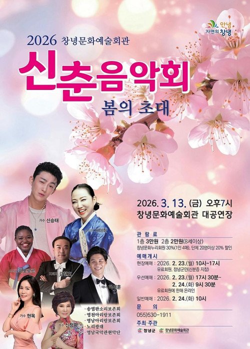 창녕군은 오는 3월 13일 오후 7시, 창녕문화예술회관 대공연장에서 2026 신춘음악회 '봄의 초대'를 개최한다.이번 공연은 김현호 지휘자가 이끄는 영남국악관현악단의 연주 아래, 대중가수 신승태와 현옥, 신정화를 비롯해 테너 하세훈, 판소리꾼 마포로르 등 실력파 아티스트들이 총출동한다.여기에 (사)송엽판소리보존회, 노리광대, 아리랑보존회의 역동적인 무대가 더해져 국악과 현대음악을 아우르는 풍성한 볼거리를 제공할 예정이다.군 관계자는 "이번 신춘음악회가 긴 겨울을 지나 새봄을 맞이하는 군민들의 일상에 따뜻한 활력을 불어넣는 소중한 시간이 되길 바란다"며 "이번 공연을 기점으로 군민과 예술회관 회원들을 위한 문화 혜택을 더욱 확대해 나갈 계획이니 많은 관심과 사랑을 부탁드린다"고 전했다.예매는 2월 23일 오전 10시부터 시작되며, 창녕군민과 문화누리 회원(유료회원)을 대상으로 현장 예매부터 우선 진행된다. 공연에 관한 자세한 사항은 창녕문화예술회관 누리집(www.cng.go.kr/art.web) 또는 전화(055-530-1911)로 문의하면 된다.