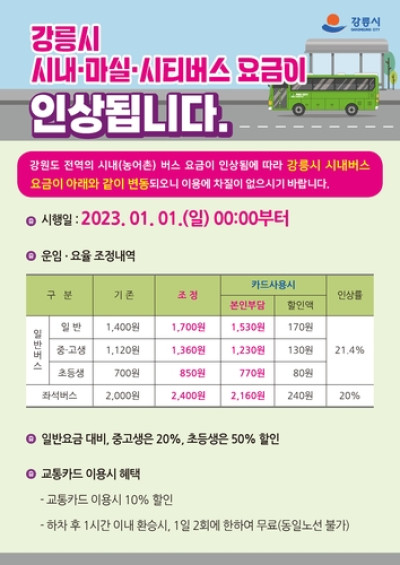 강릉시, 2023년부터 시내·마실·시티버스 요금 인상