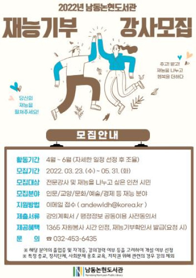 남동논현도서관, 2022 상반기 재능기부 강사 모집