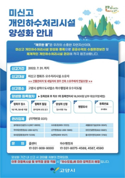고양시, '미신고 개인하수처리시설' 신고하세요