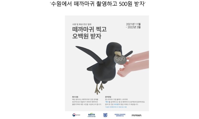 경기 수원시에서 출몰한 떼까마귀를 촬영해 '캐다' 앱에 등록하면 500원을 받을 수 있다.환경부는 한국환경산업기술원(KEITI), 서울대학교, 서울대학교 환경대학원 생태계획연구실,…