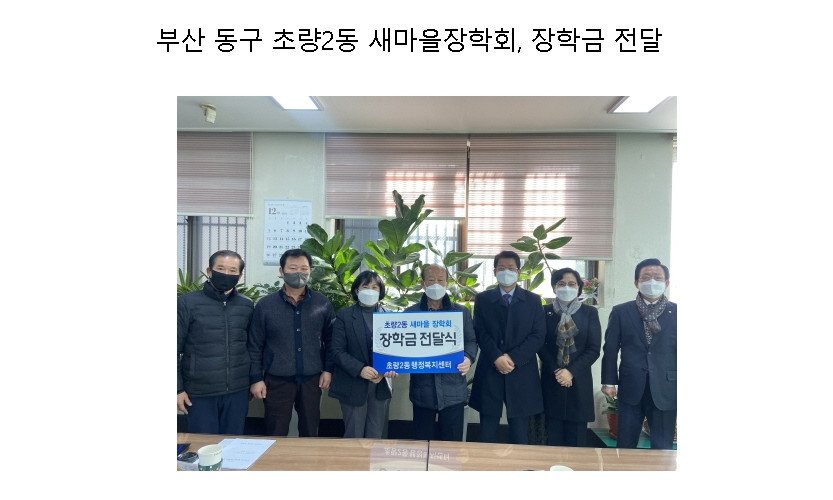 부산 동구 초량2동 새마을장학회(회장 박경수)는 지난 15일, 관내 경제적인 어려움 속에서도 솔선수범하여 모범이 되는 대상자 4명에게 50만 원씩 총 200만 원의 장학금을 지원하…