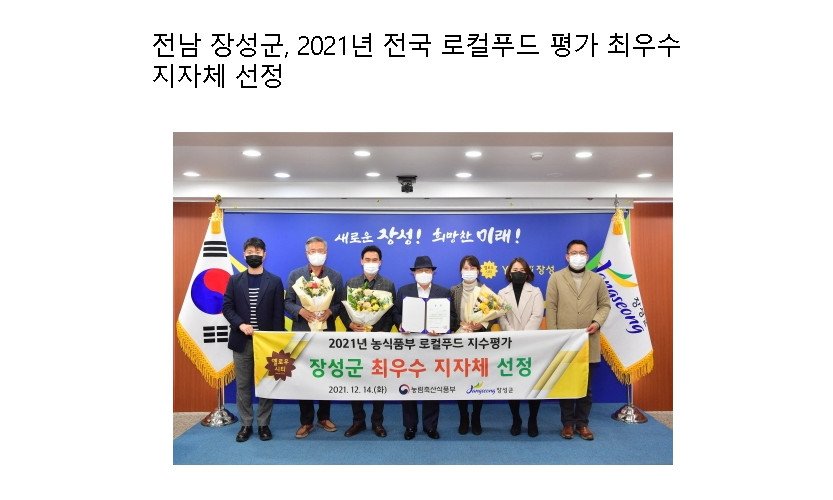 전남 장성군, 2021년 전국 로컬푸드 평가 최우수 지자체 선정