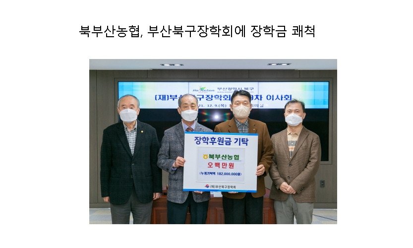 부산북구장학회(이사장 박홍근)는 북부산농협(조합장 이승걸)이 지역의 청소년과 청년들의 학업에 도움이 되고자 재단법인 부산북구장학회에 장학기금 5백만 원을 쾌척했다고 13일 밝혔다.…