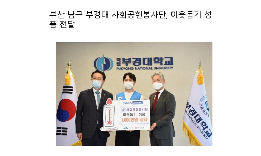 부경대학교(총장 장영수) 사회공헌봉사단(단장 손민우)은 지난 7일, 부산사회복지공동모금회가 주최하는 희망2022 나눔캠페인을 통해 부산 남구(구청장 박재범) 관내 장애인 및 어려운…