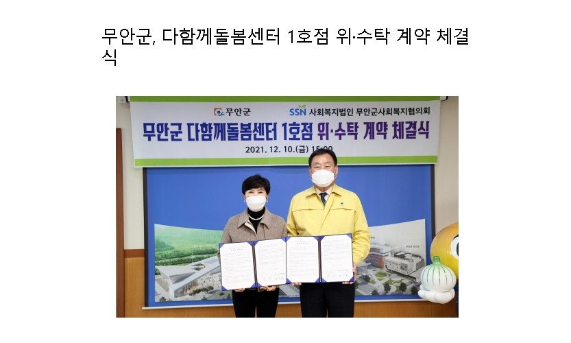 전남 무안군은 지난 10일 군청 군수실에서 사회복지법인 무안군 사회복지협의회(회장 나민희)와 무안군 다함께돌봄센터 1호점 위·수탁 계약 체결식 행사를 했다고 밝혔다.군은 이번 계약…