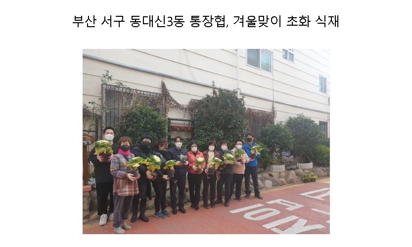 부산 서구 동대신3동 통장협의회(회장 서명범)는 12월 9일 관내 가로화단 3개소에 내년에 꽃이 개화하는 꽃양배추 50본, 백묘국 100본 등 겨울 초화 150본을 심어 마을 환경…