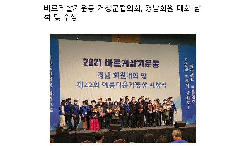 바르게살기운동 거창군협의회(회장 김홍조)는 지난 9일 바르게살기경상남도 협의회가 주최하고 경상남도가 주관한 2021년 경남회원대회 및 제22회 아름다운 가정상 시상식에 참석했다.바…