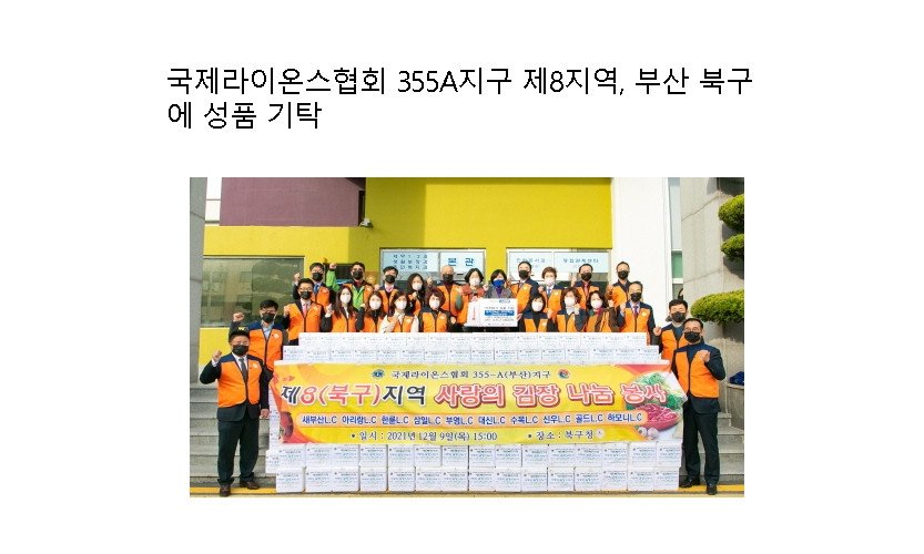 부산 북구(구청장 정명희)는 국제라이온스 355-A지구 제8지역(부총재 정보경)이 지난 12월 9일 북구청을 방문해 어려운 이웃에게 전달해달라며 350만 원 상당의 김장김치 300…