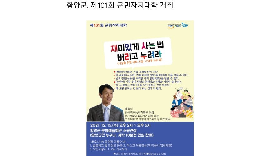경남 함양군은 오는 12월 15일 오후 3시부터 5시까지 문화예술회관 소공연장에서 군민을 위한 군민자치대학을 운영한다.지난 2005년부터 강연을 시작한 함양군 군민자치대학은 평소 …