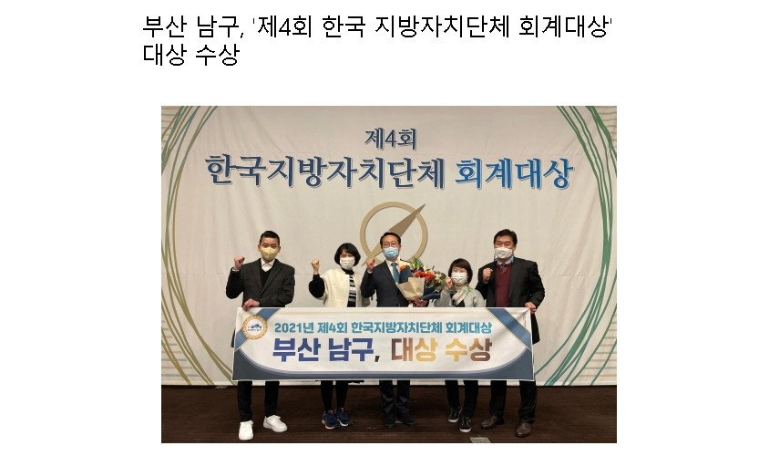 부산 남구, '제4회 한국 지방자치단체 회계대상' 대상 수상