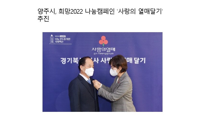 경기 양주시(시장 이성호)는 오는 2022년 1월 31일까지 '나눔, 모두를 위한 사회백신'을 슬로건으로 희망2022 나눔캠페인 사랑의 열매달기 행사를 전개한다.'희망2022 나눔…