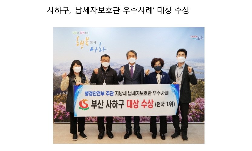 부산 사하구(구청장 김태석)는 행정안전부 주관 '2021년 지방세 납세자보호관 우수사례 발표대회'에서 가장 높은 점수를 받아 대상을 수상했다.이번 대회에서는 전국 광역·기초자치단체…