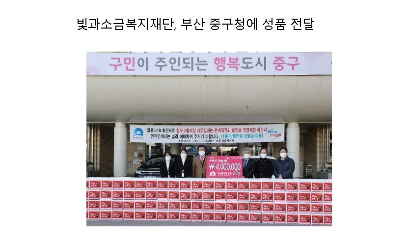 빛과소금복지재단(대표이사 김대훈)은 지난 8일 부산 중구청(구청장 최진봉)을 방문해 관내 취약계층을 위한 김치 200박스(400만 원 상당)를 전달했다.(끝)출처 : 부산중구청 보…