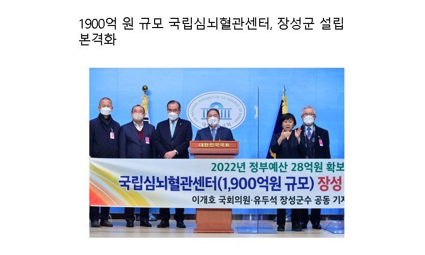 전남 장성군이 9일 국회 기자회견을 하고 1900억 원 규모 국립심뇌혈관센터 설립을 본격화한다고 밝혔다.국회 정론관에서 열린 이 날 기자회견에는 유두석 장성군수, 이개호 국회의원을…