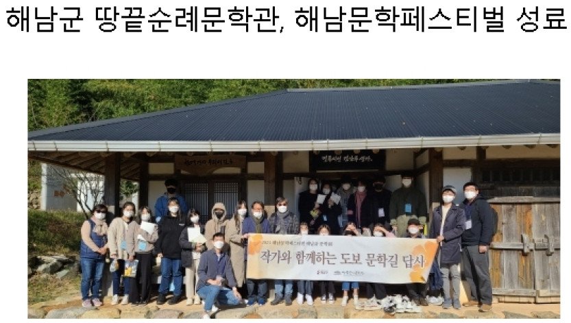 해남군(군수 명현관) 땅끝순례문학관이 지난 11월 한 달간 운영했던 '2021 해남문학페스티벌 - 해남詩 문학洞'이 많은 참여 속에 성료 됐다.특히 지역의 문화예술인들과 함께 해남…