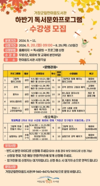 거창군 한마음도서관, 하반기 독서문화 프로그램 수강생 모집