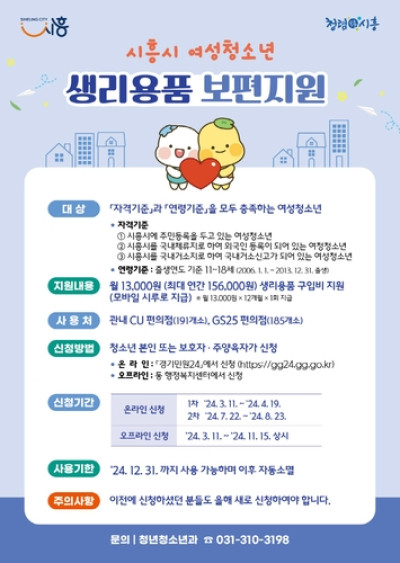 시흥시, 여성 청소년에 생리용품 보편 지원…하반기 온라인 신청 개시