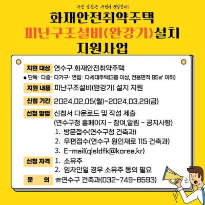 연수구, 화재안전취약주택에 피난구조설비 무상 설치 지원