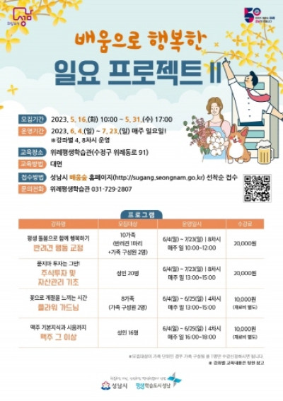 성남시 위례평생학습관, '배움으로 행복한 일요 프로젝트Ⅱ' 수강생 모집