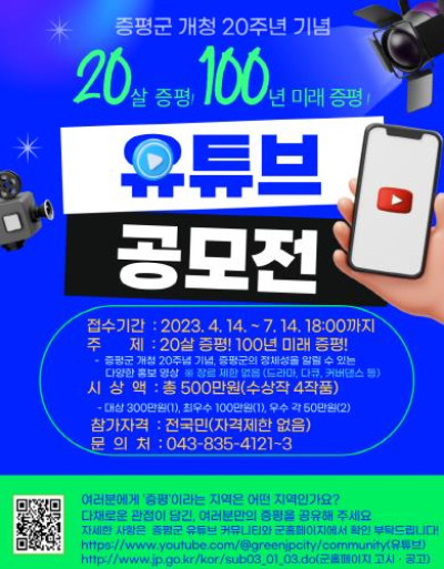 증평군, '20살 증평! 100년 미래 증평!' 유튜브 공모전 개최