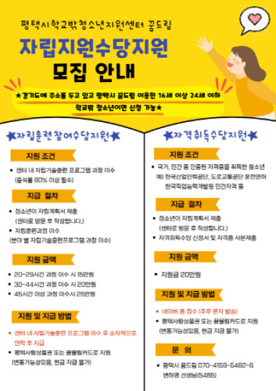 평택시, 학교 밖 청소년 자립지원수당 지원 대상자 모집