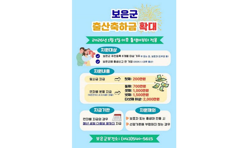 충북 보은군은 저출생 극복과 출산·양육 가정의 경제적 부담 완화를 위해 2026년부터 출산축하금 지원을 확대 시행한다고 밝혔다.
