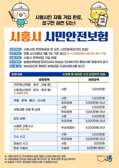 시흥시(시장 임병택)는 각종 재난과 사고로부터 피해를 본 시민에 대해 생활 안정을 지원하기 위해 '시흥시 시민안전보험'을 연중 운영하고 있다.