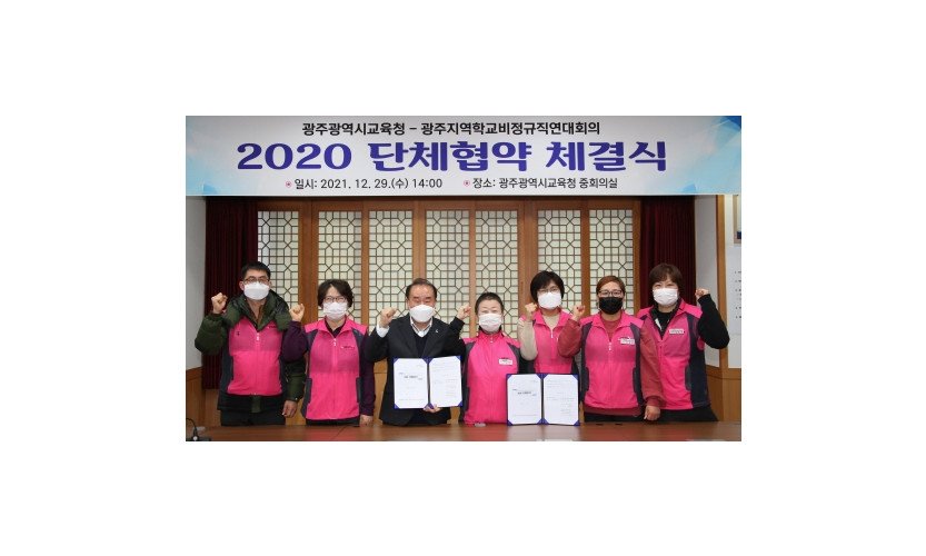 광주시교육청이 29일 중회의실에서 광주지역학교비정규직연대회의(전국학교비정규직노동조합,전국여성노동조합,전국공공운수노동조합)와 2020 단체협약 체결식을 했다.체결식은 장휘…