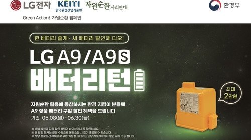 LG전자는 8일부터 오는 6월 30일까지 프리미엄 무선청소기 코드제로 A9과 A9S에 사용했던 폐배터리를 수거해 고객이 자원순환에 참여할 수 있도록 하고 새 배터리 구입 시 할인해주는 '배터리턴' 캠페인을 진행한다.