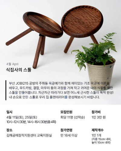 오는 4월에는 '나의 작은 정원'을 주제로 최근 확산하는 식물 키우기 문화에 주목해 '식집사의 스툴'을 만들어본다.