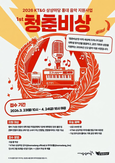 KT&G 상상마당이 신진 뮤지션을 희망하는 대학생을 발굴하고 육성을 지원하는 프로그램 '2026 청춘비상' 공모를 오는 4월 24일까지 진행한다.