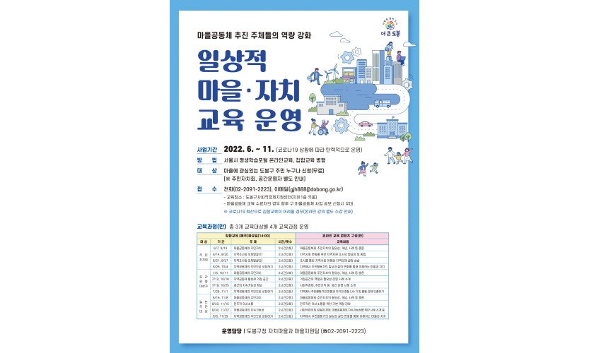 서울 도봉구(구청장 이동진)는 2022년 6월 7일부터 11월 29일까지 마을과 자치에 관심 있는 지역주민을 대상으로 '일상적 마을·자치 교육' 수강생을 모집한다.이번 …