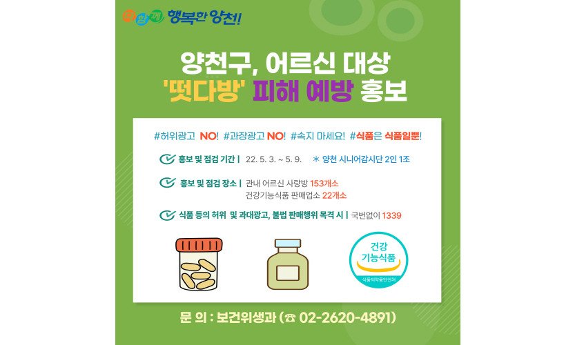 양천구는 가정의 달을 맞아 오는 9일까지 식품을 약처럼 허위·과대 광고해 판매하는 행위인 일명 '떳다방'에 대한 피해 예방 홍보활동과 건강기능식품 판매업소에 대한 지도·…