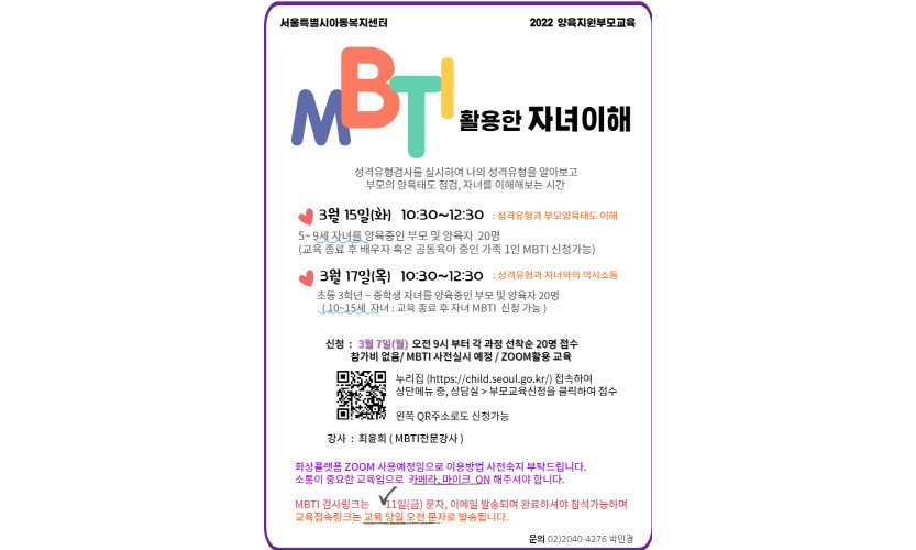 서울시, 'MBTI를 활용한 자녀이해 교육' 참여 부모 40명 선착순 모집