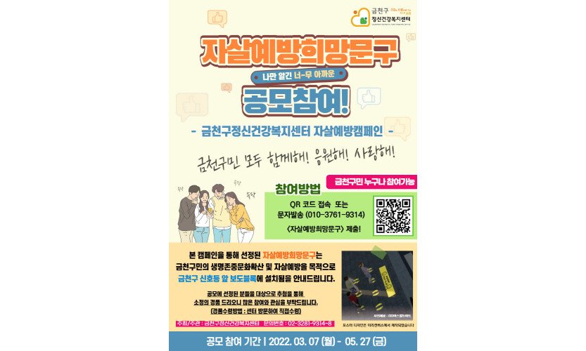 금천구(구청장 유성훈)는 금천구정신건강복지센터에서 5월 27일까지 자살 예방 캠페인을 위한 '자살예방 희망문구'를 공모한다고 밝혔다.이번 공모는 금천구의 생명 존중 문화…