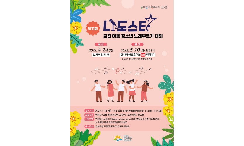 서울 금천구(구청장 유성훈)가 3월 14일부터 4월 8일까지 '제11회 나도스타 금천 아동·청소년 노래 부르기 대회' 참가자를 모집한다.이번 대회는 아동·청소년이 모두 …