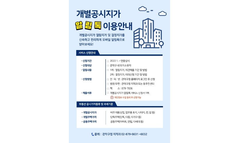 서울 관악구(박준희 구청장)가 올해부터 개별공시지가 정보를 신속하게 안내하는 '개별공시지가 알림톡 서비스'를 시행한다고 밝혔다.구는 매년 개별토지의 단위면적당 가격인 개…