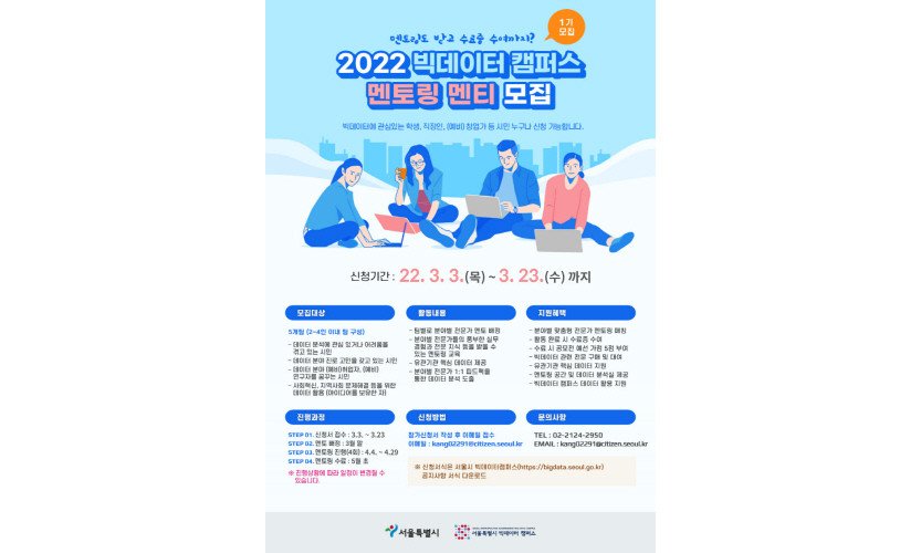 서울특별시는 빅데이터 분석에 관심이 있으나 실질적인 경험이 없어 어려움을 겪고 있는 시민, 취업준비생, 예비연구가 등을 대상으로 '2022 서울시 빅데이터캠퍼스 멘토링'…