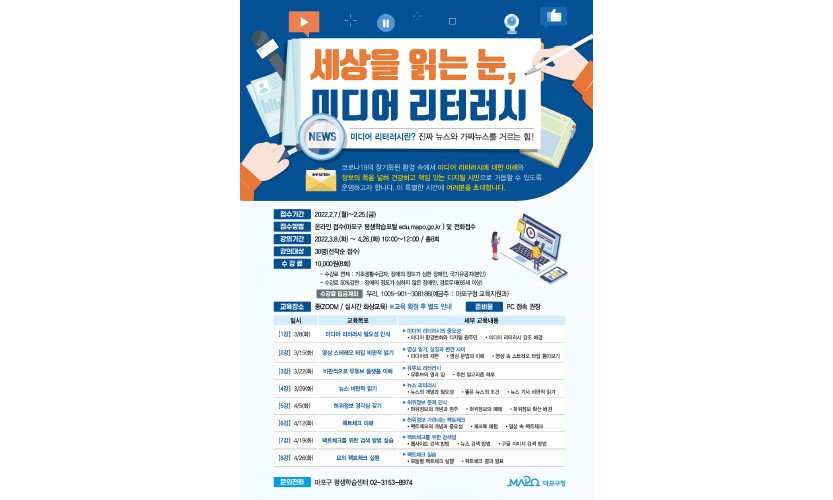 서울 마포구(구청장 유동균)는 오는 25일까지 2022년 상반기 마포대학 특강 '세상을 읽는 눈, 미디어 리터러시' 수강생 30명을 선착순 모집한다고 11일 밝혔다.구는…