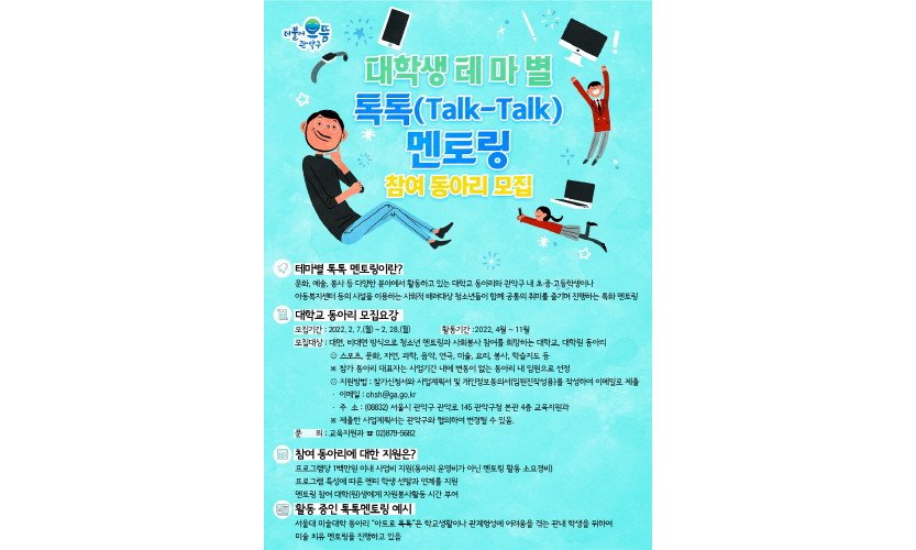 서울 관악구(구청장 박준희)가 재능기부 사업으로 진행하는 대학생 테마별 톡톡(Talk-Talk) 멘토링 참여 동아리를 오는 28일까지 모집한다.톡톡(Talk-Talk) …