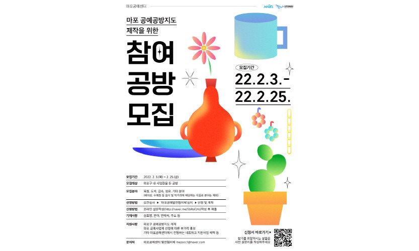 서울 마포구(구청장 유동균)는 '2022년 마포 공예공방지도'에 실릴 참여공방 모집을 오는 25일까지 받는다고 9일 밝혔다.구는 지역 문화 자원을 활용해 지역경제 활성화…