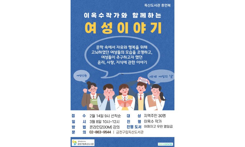 서울 금천문화재단(대표이사 오진이)은 금천구립독산도서관에서 3월 8일 오전 10시에 '이옥수 작가와 함께 하는 여성 이야기' 특강을 진행한다고 밝혔다3월 8일은 세계 여…