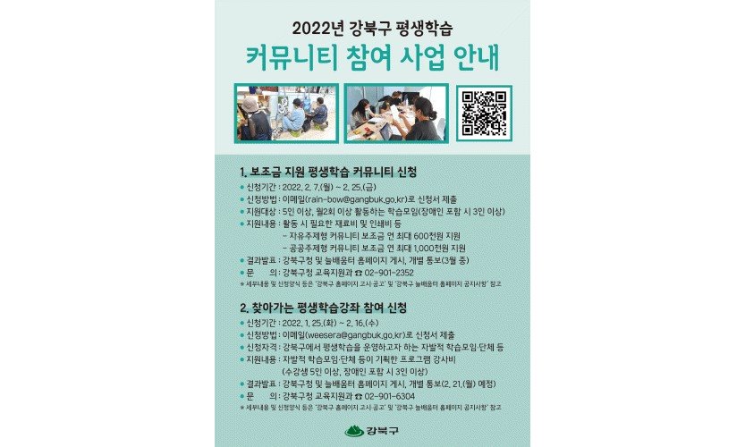 서울 강북구(구청장 박겸수)가 다양한 평생학습의 기회를 제공하기 위해 '찾아가는 평생학습강좌'를 운영한다.'찾아가는 평생학습강좌'는 이용자들이 필요로 하는 강좌를 기관·…