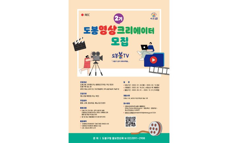 서울 도봉구(구청장 이동진)가 지역주민이 직접 도봉구의 공식 유튜버가 돼 활동하는 '도봉영상크리에이터(이하 도영크) 2기'를 모집한다.도봉영상크리에이터는 2022년 1월…