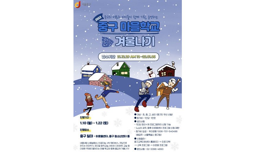 서울 중구(구청장 서양호) 교육지원센터 '이로움'에서 주최한 마을학교 '룰루랄라, 마을학교 겨울나기'가 지난 22일 성황리에 마무리됐다.'마을학교'는 학교 밖 마을에서 …